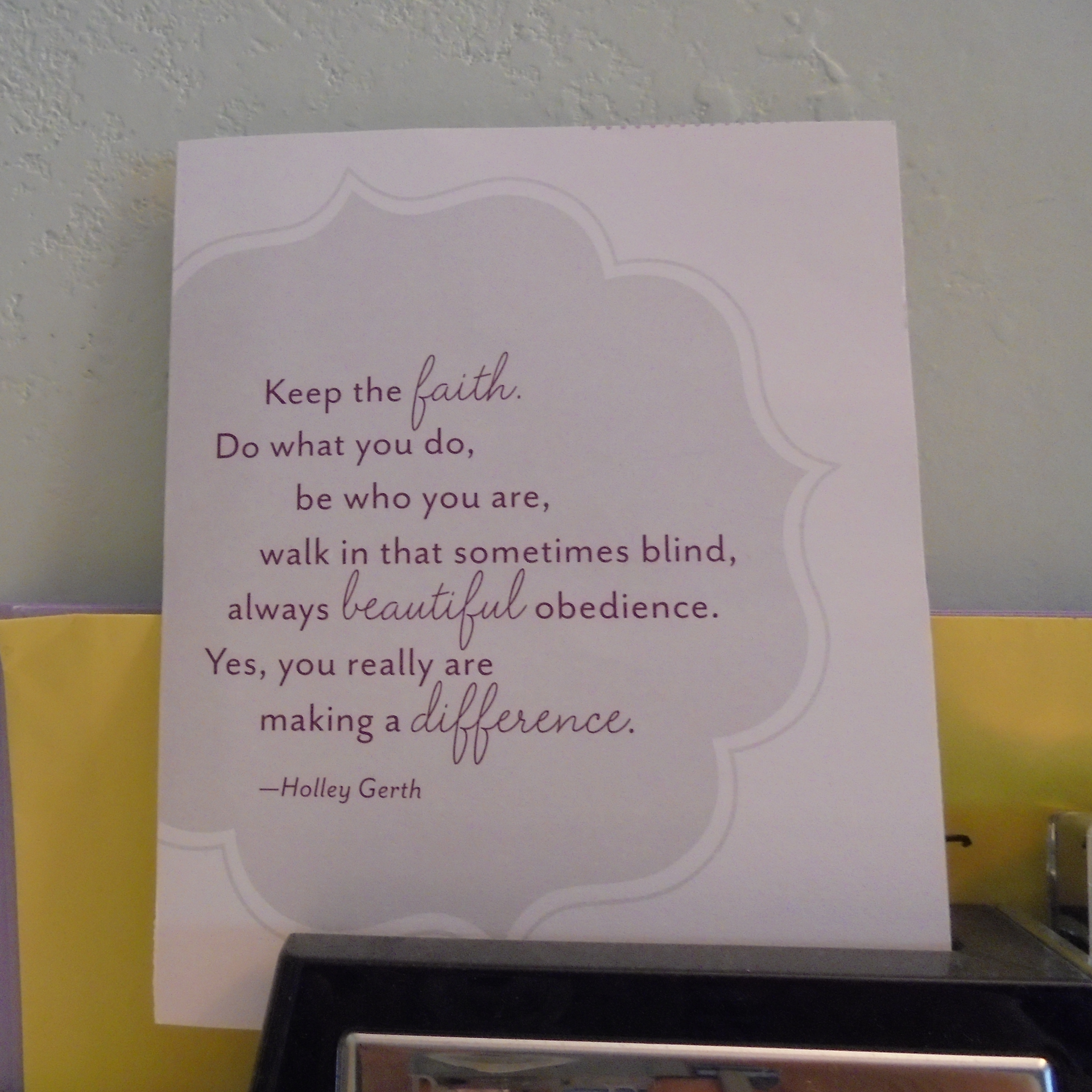 I have a makeshift desk on top of my mantle full of pictures, a baby hand print, and random knickknacks. It’s ideal because it’s the perfect height for me to stand as I work and keeps my laptop out of little hands’ reach. I also have a timely quote that I received in a package of clearance Christmas cards a few months back on my “desk”. It encouraged me then and continues to encourage me when I see it from time to time, so I hope it brings you hope today.